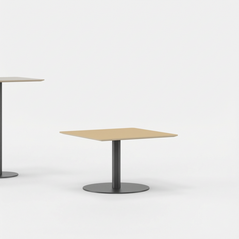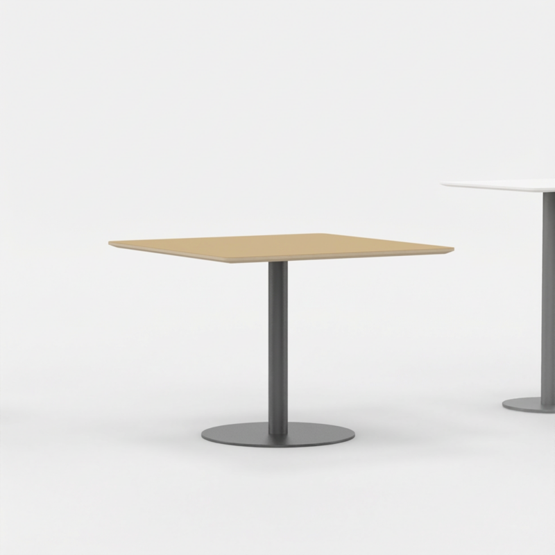 Melamine bladen worden afgewerkt met kantenband. De hoekafwerking bij vierkante tafels is standaard met een hoek R2 mm. Optioneel met een afronding R5 cm.