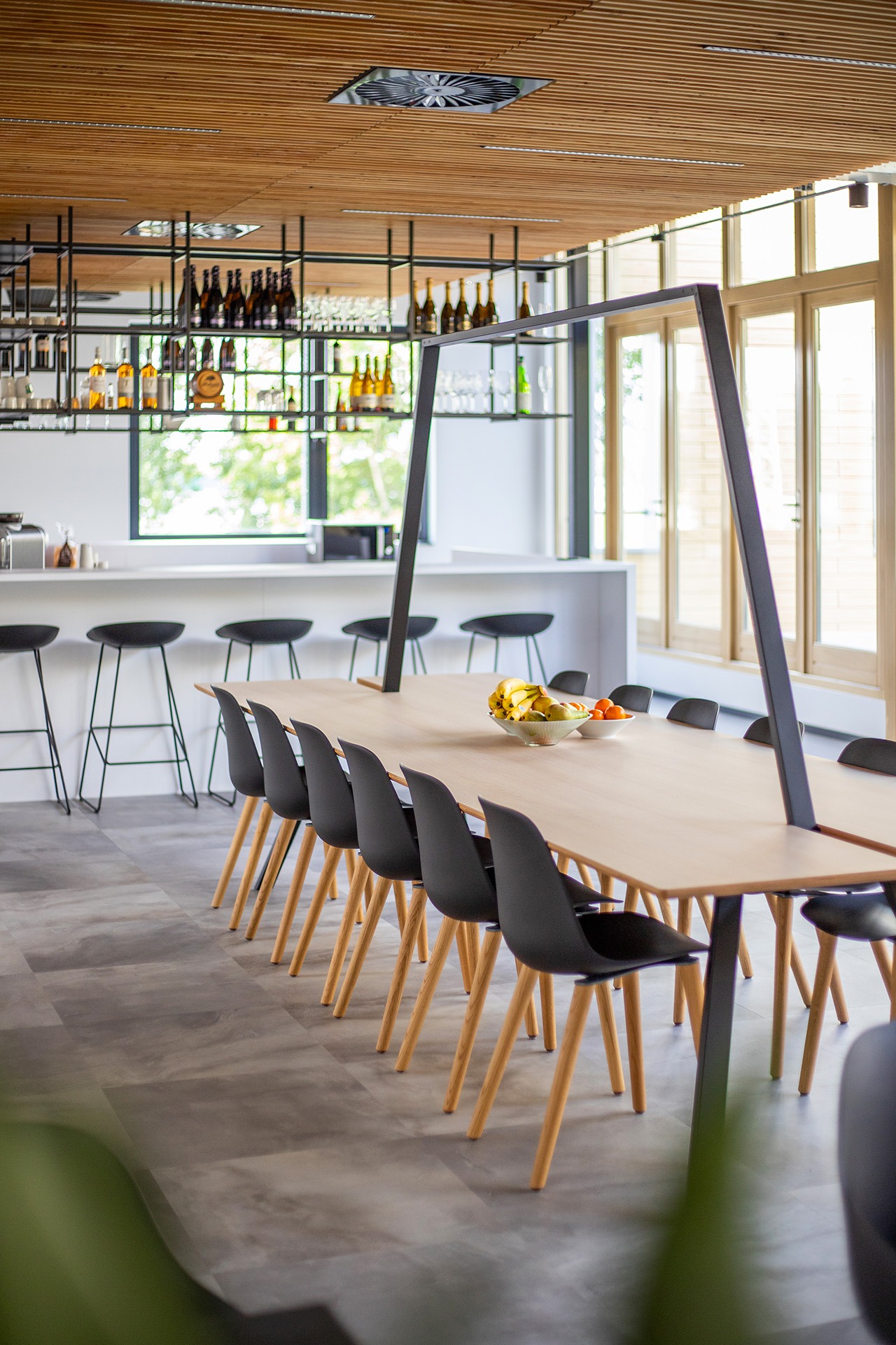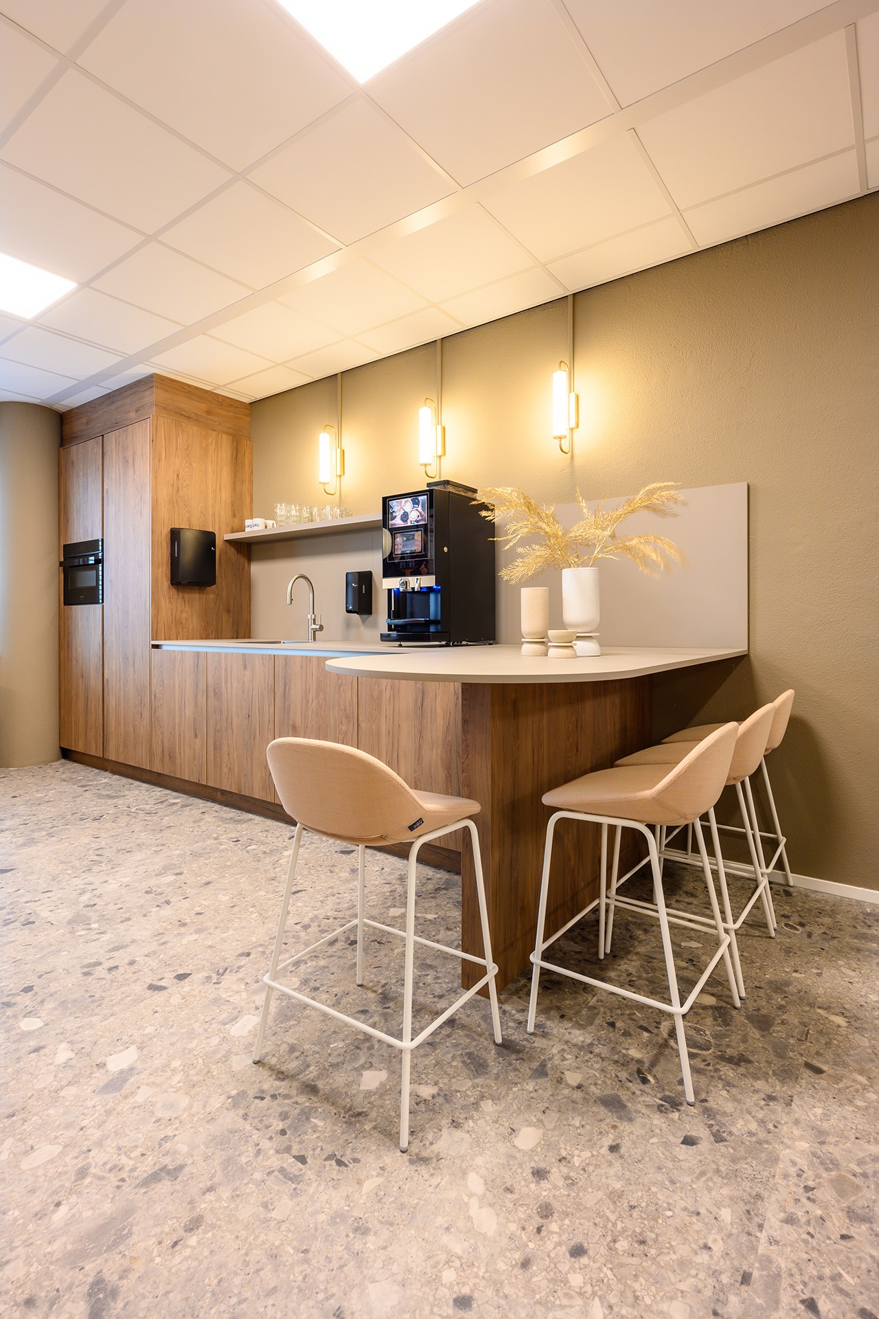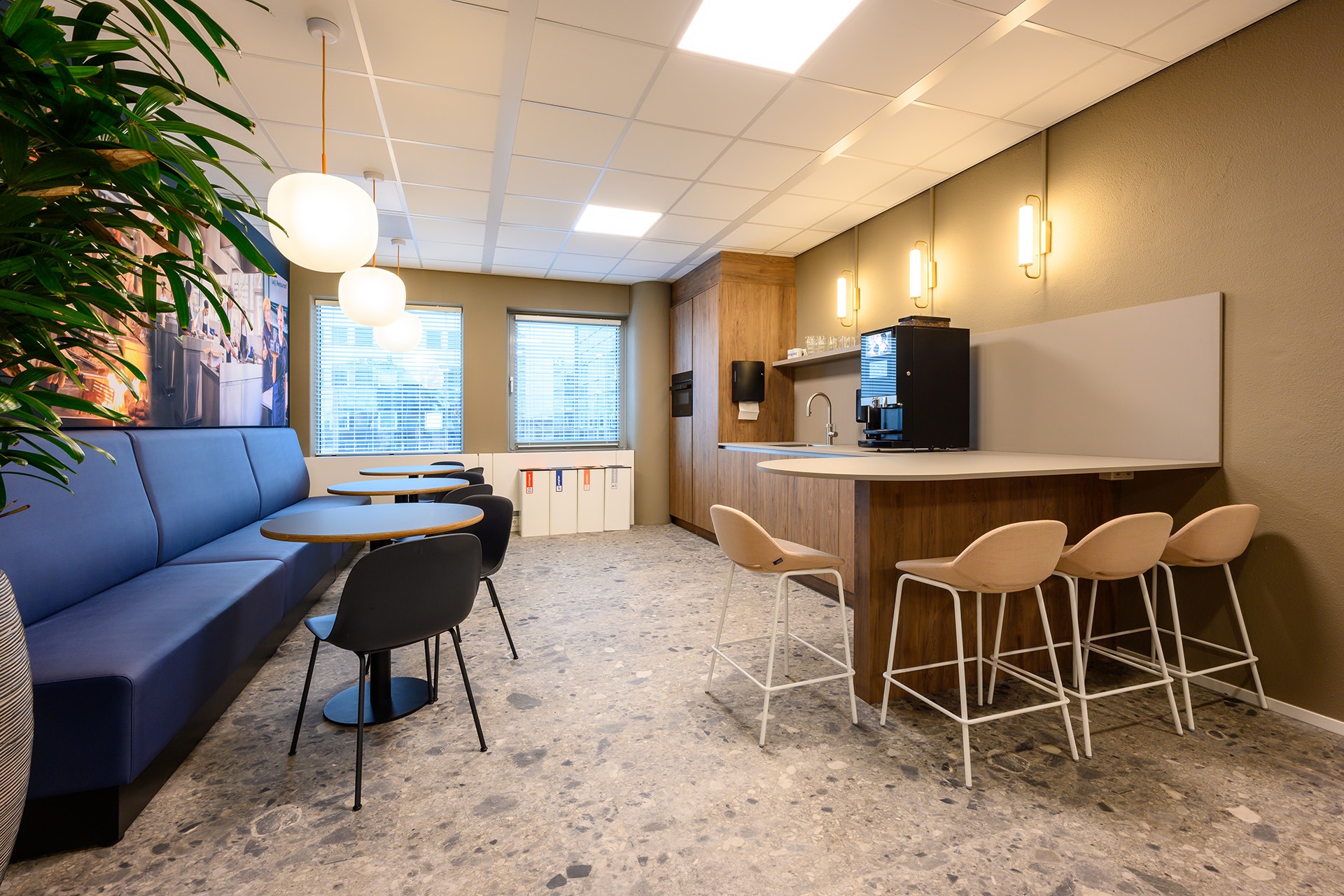 In het hart van het nieuwe kantoor van Spinoza is een multifunctionele zone gecreëerd. De grote open ruimte fungeert als ontmoetingsplek voor de medewerkers: een plek om samen te komen, lunchen en elkaar te ontmoeten.