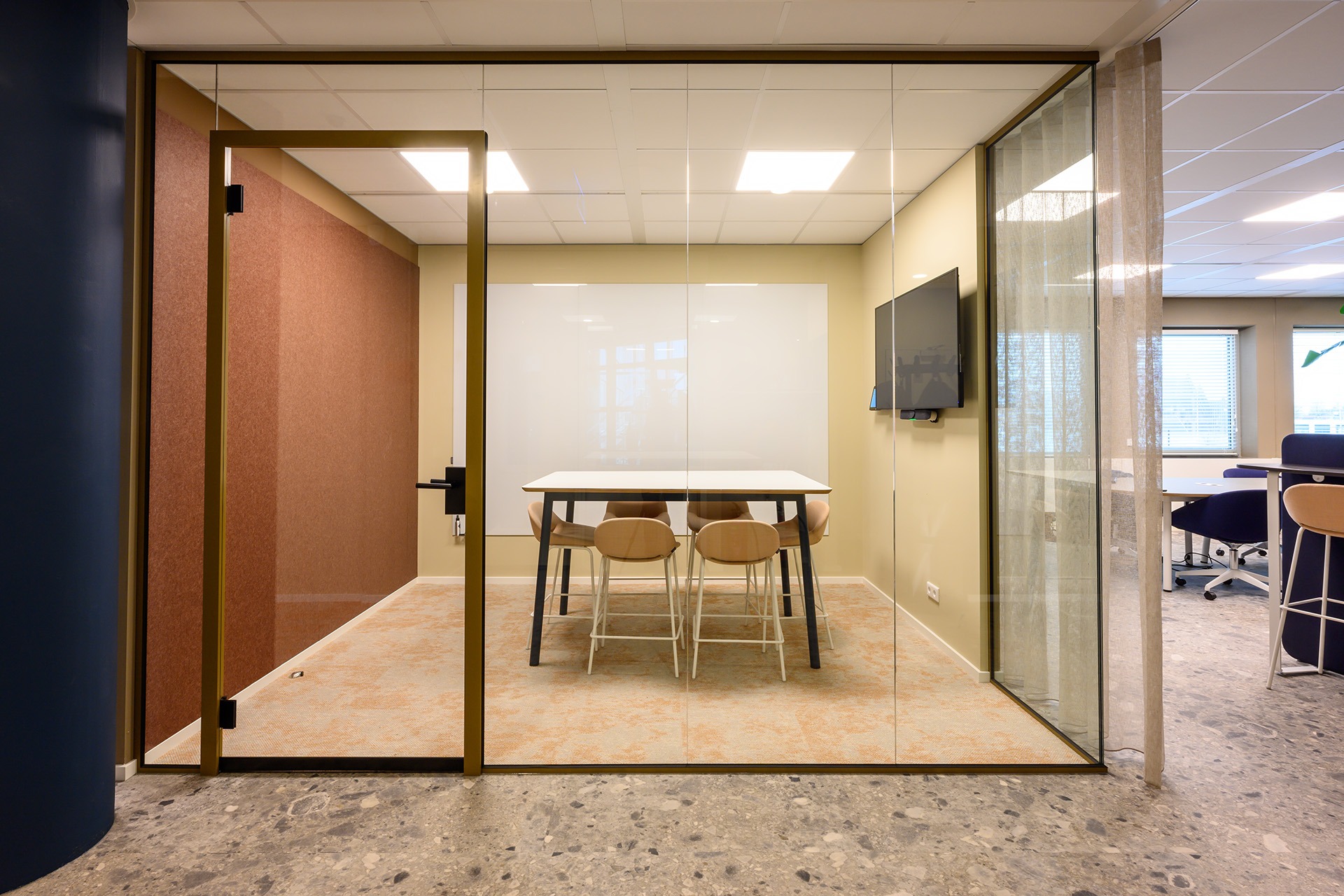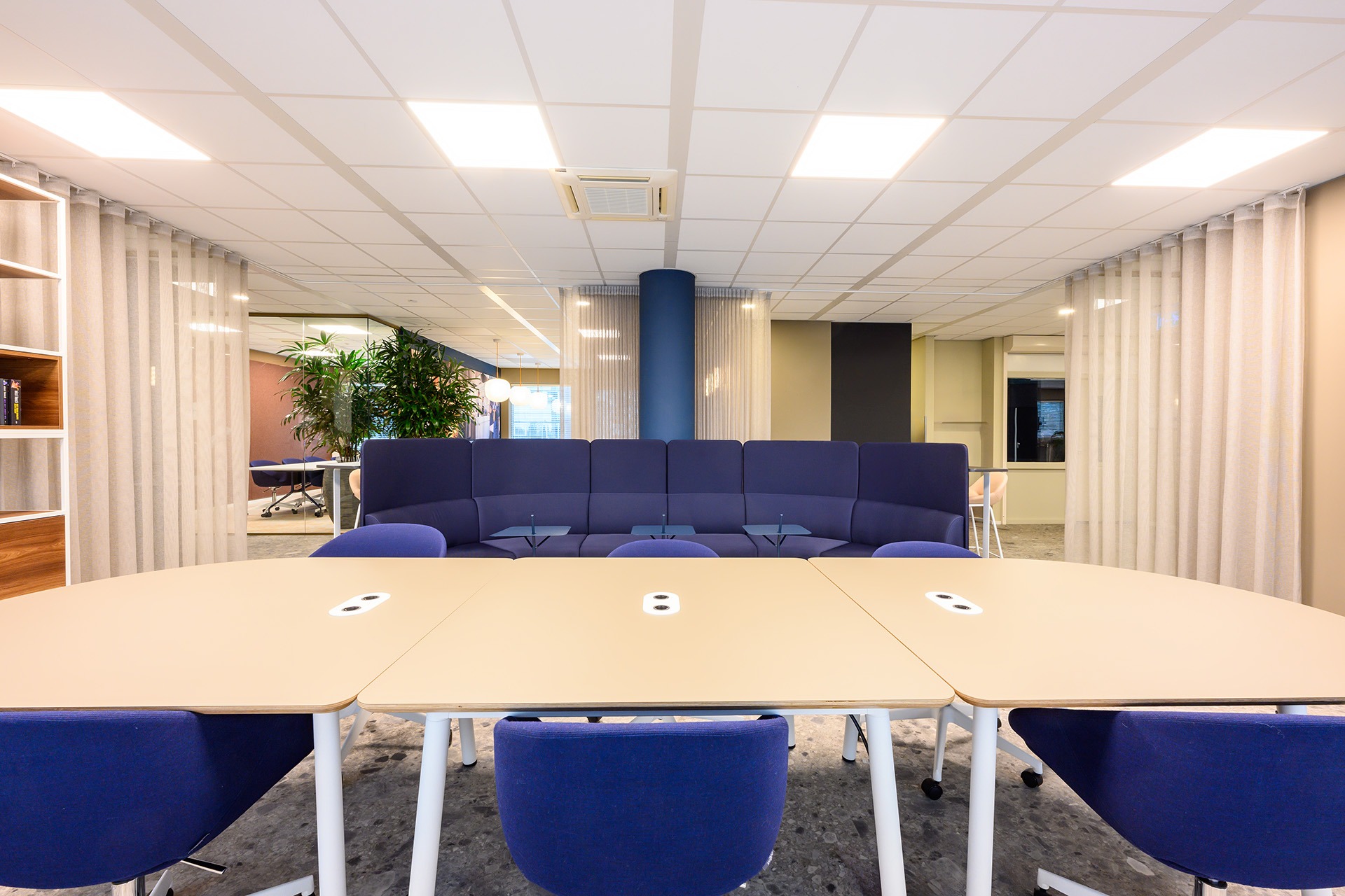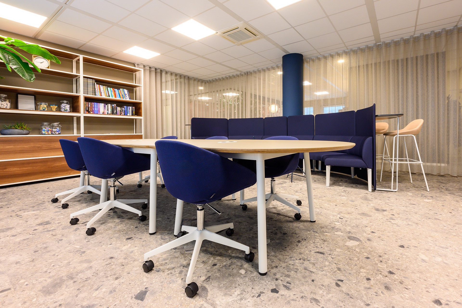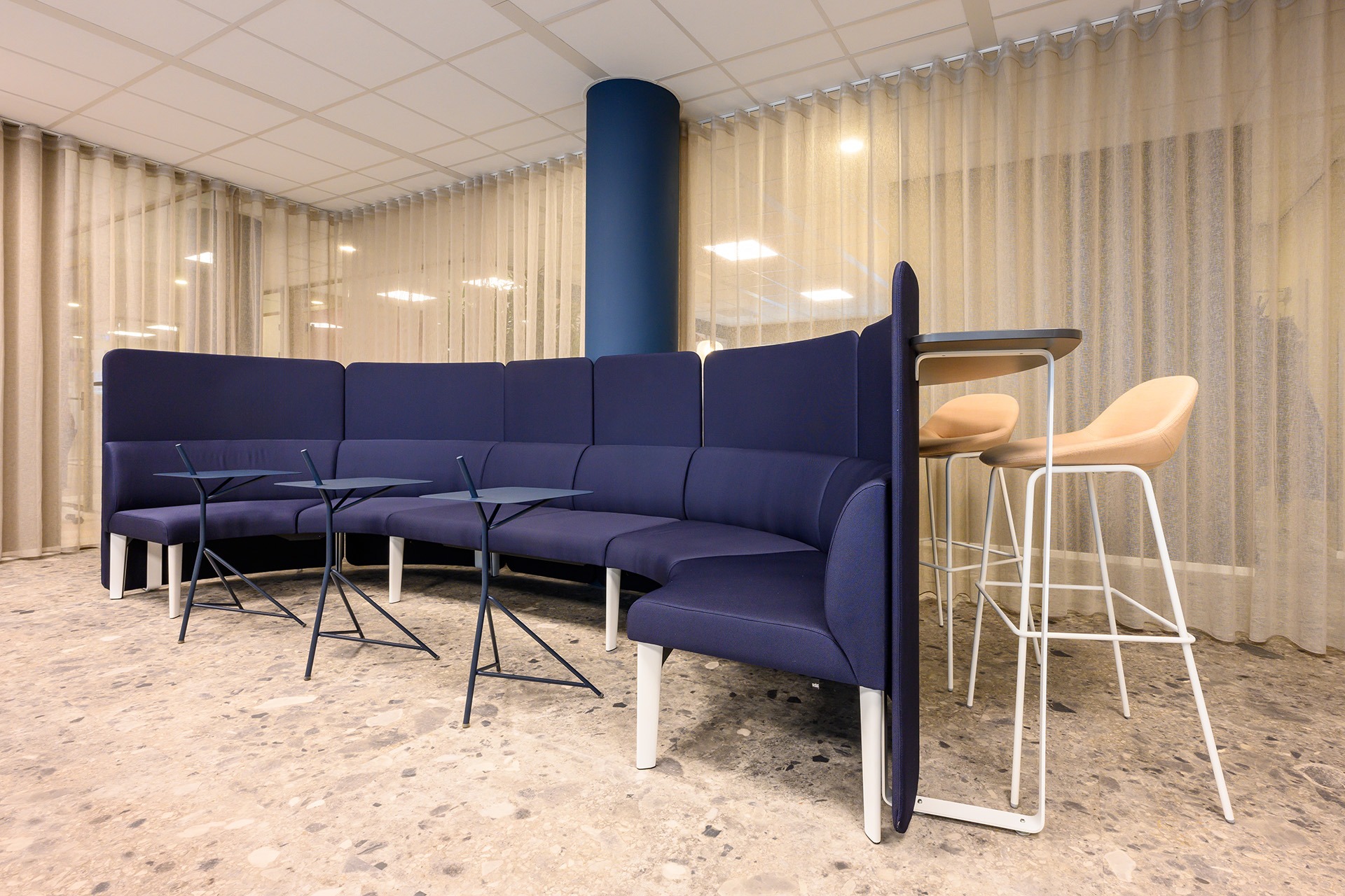 Rondom deze open ruimte zijn verschillende vergaderunits geplaatst. Hier kun je o.a. hoog en laag zitten aan de Lande Node tafels. Deze veelzijdige tafel past perfect in de vergaderruimtes en biedt zowel stijl als functionaliteit. Door de verscheidenheid aan vergaderunits is er flexibiliteit gecreëerd, waarbij medewerkers hun werkplek kunnen aanpassen aan de situatie.