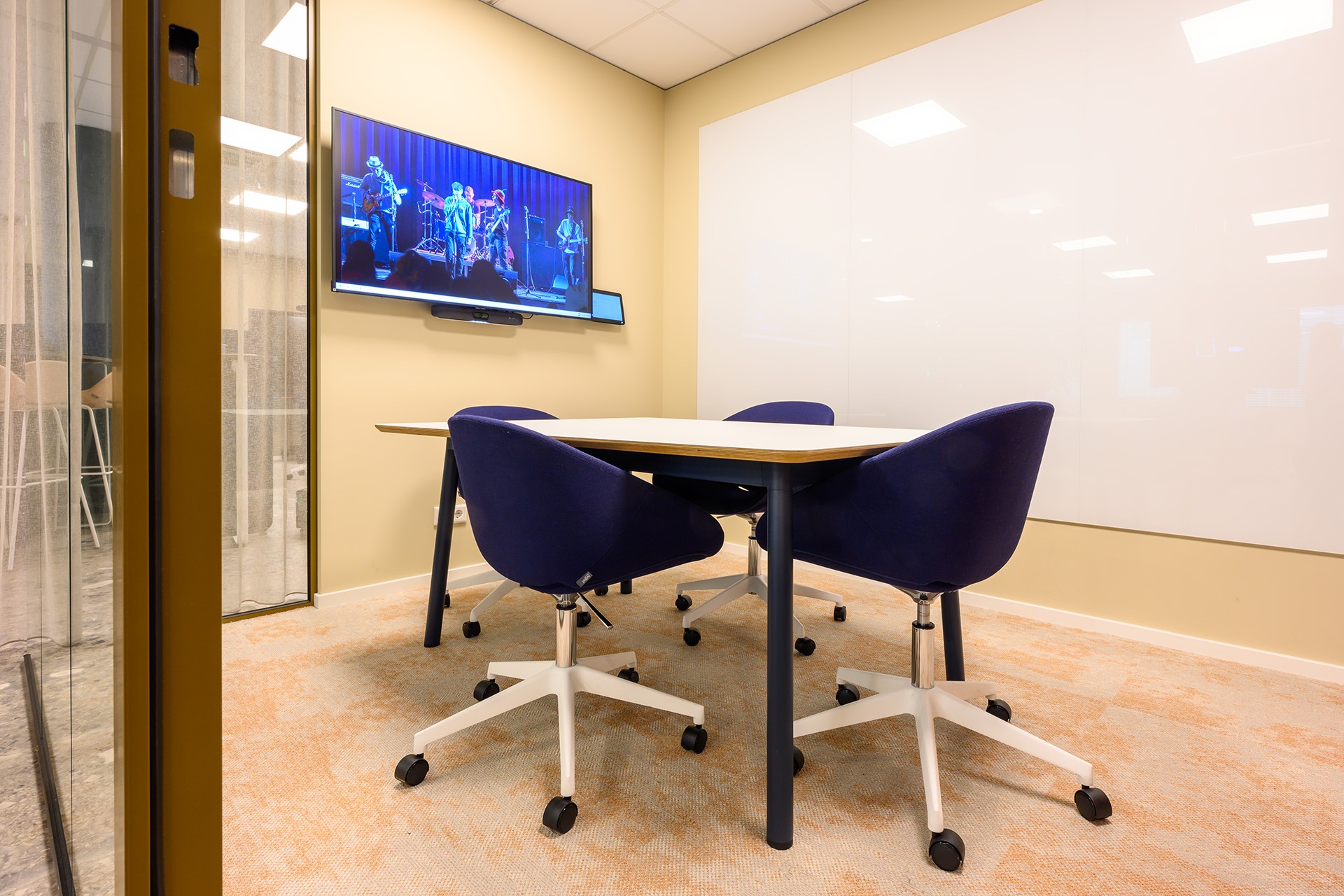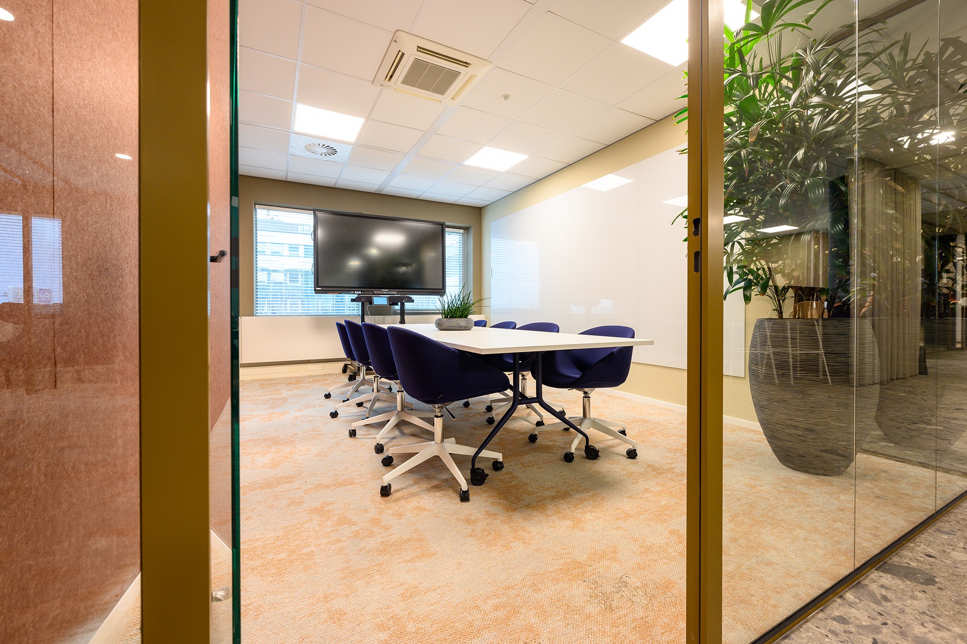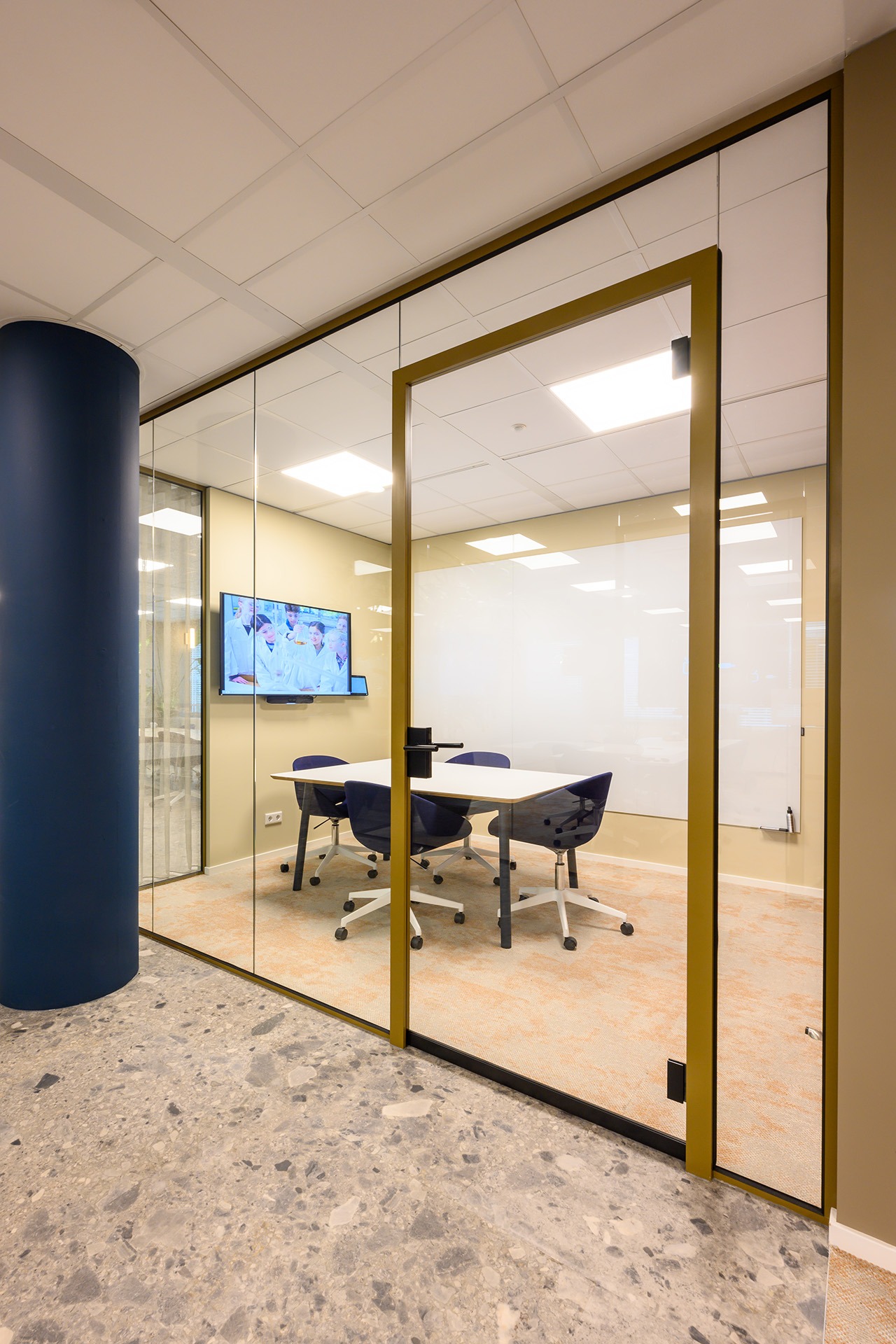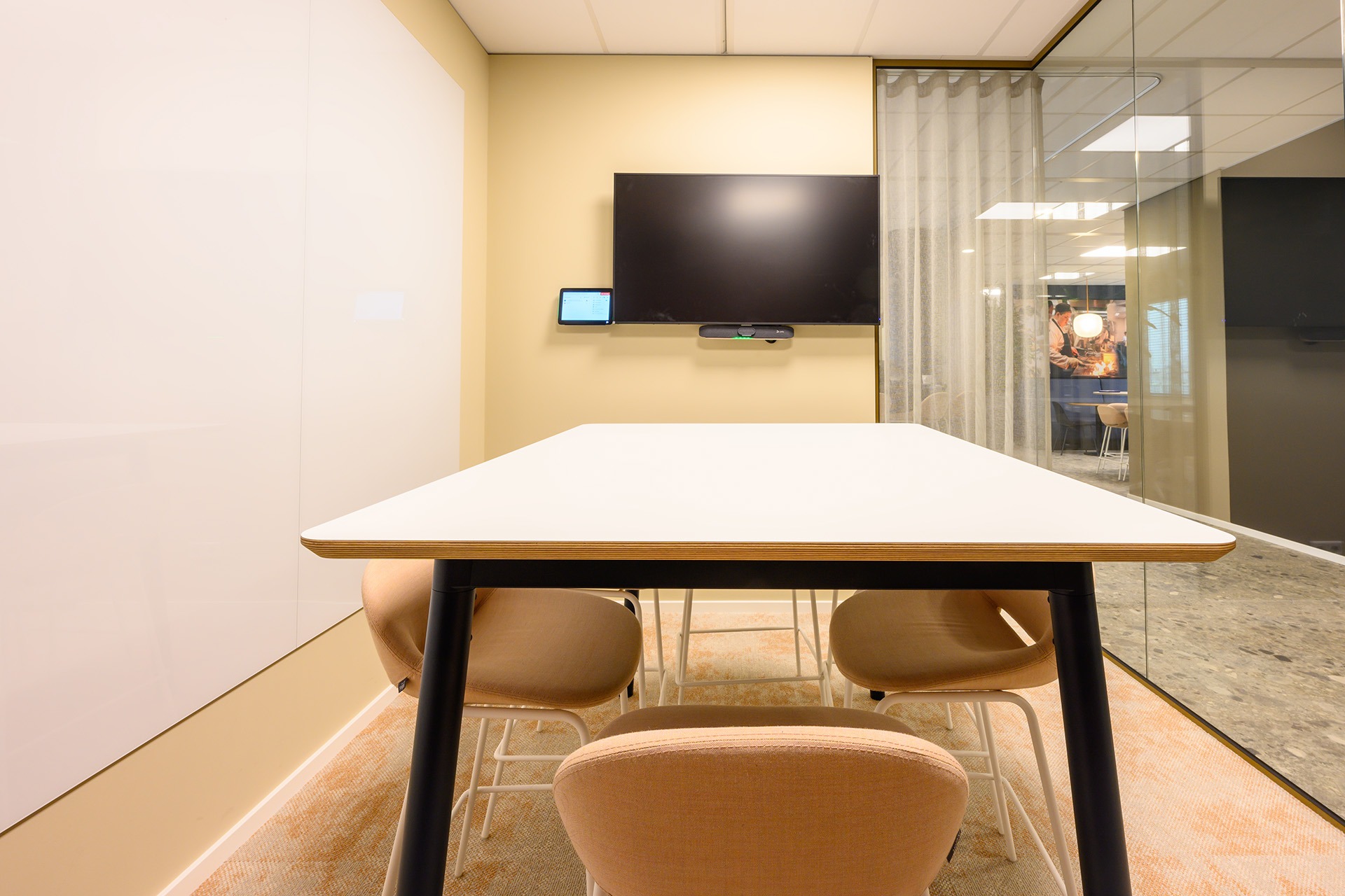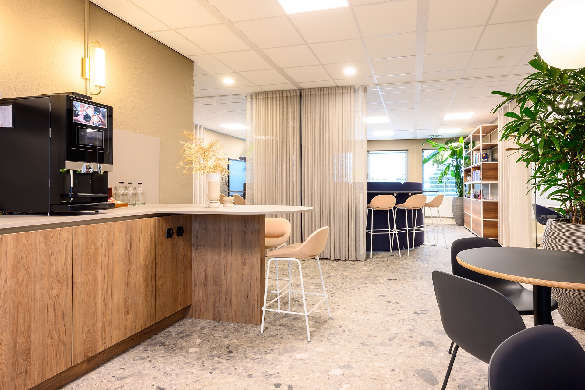 Rondom deze open ruimte zijn verschillende vergaderunits geplaatst. Hier kun je o.a. hoog en laag zitten aan de Lande Node tafels. Deze veelzijdige tafel past perfect in de vergaderruimtes en biedt zowel stijl als functionaliteit. Door de verscheidenheid aan vergaderunits is er flexibiliteit gecreëerd, waarbij medewerkers hun werkplek kunnen aanpassen aan de situatie.