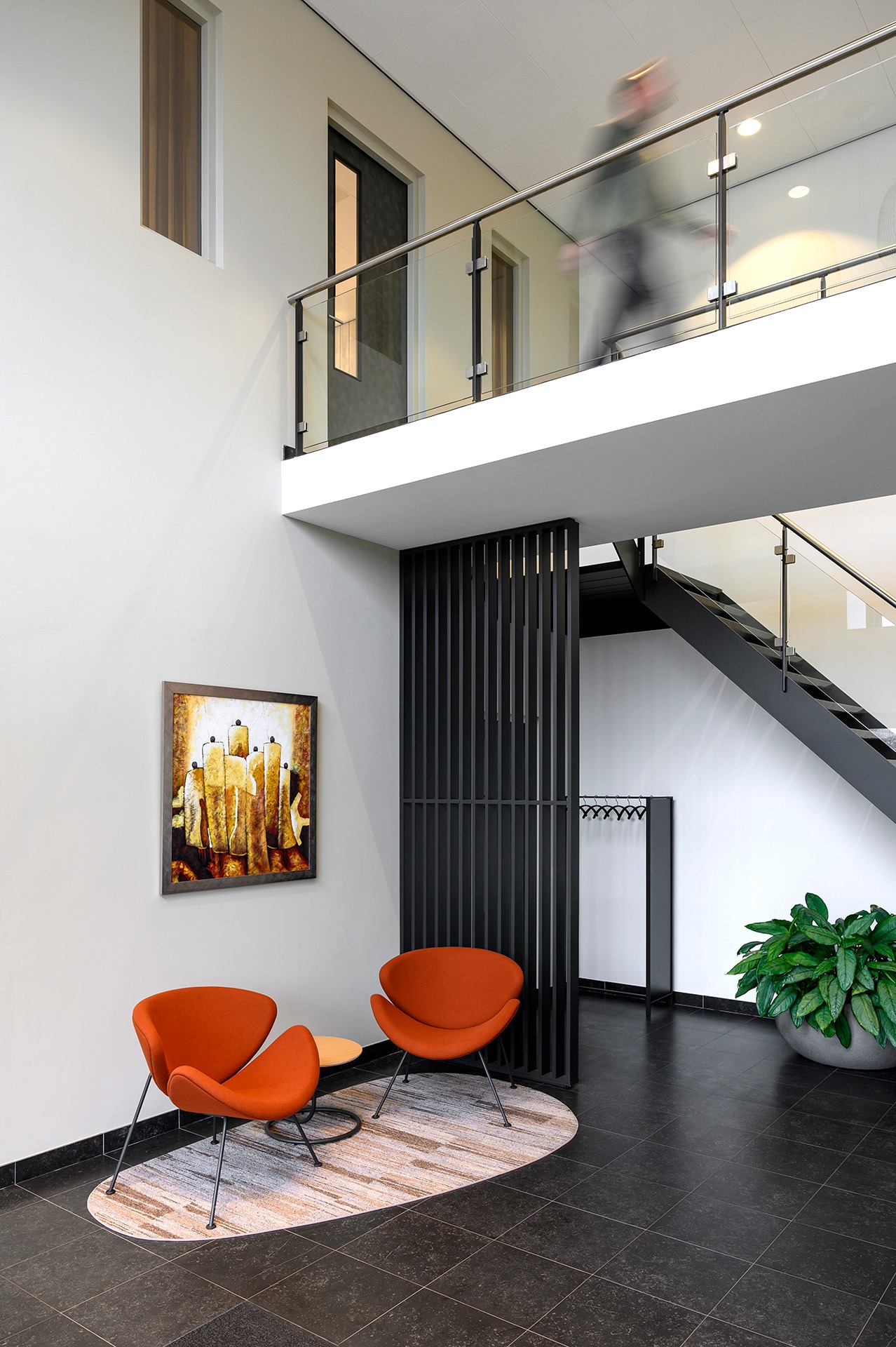 Voor aannemingsbedrijf Wouters in Schijndel, specialist in utiliteitsbouw, logistiek en industrie, is binnen het bestaande pand gewerkt aan een grondige vernieuwing van de entreehal met trap en twee vergaderruimten. De ruimtes vragen om een functionele, overzichtelijke inrichting die aansluit bij het karakter van het bedrijf: praktisch, professioneel en toekomstgericht.